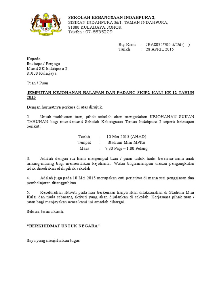 Contoh surat makluman program kepada ibu bapa.