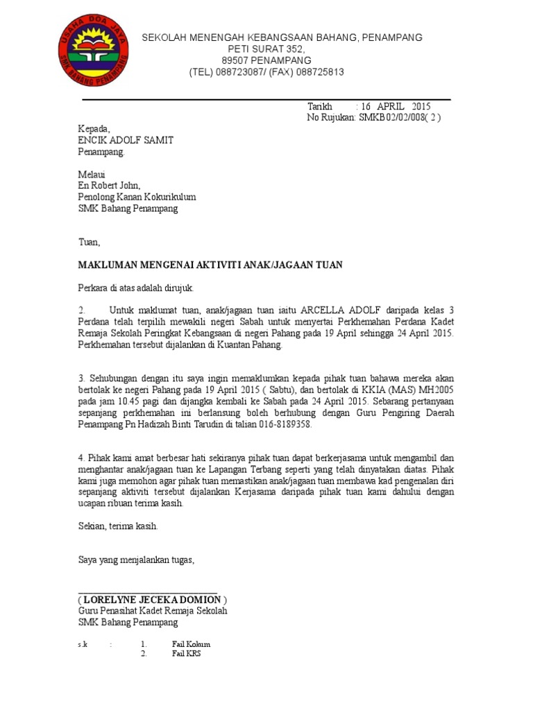 Sekarang, mari kita coba membuat surat terima kasih untuk orangtua kita sendiri. Maka dengan ini kami memberitahukan kepada bapak/ ibu wali murid kelas x (sepuluh) acara study tour akan dilaksanakan pada : Makluman tidak hadir ke sekolah. Kepada ayah dan ibu, melalui surat ini, aku ingin mengatakan bahwa kalian berdua sangat berarti bagiku. Contoh surat makluman ibu bapa utk program. 100%(1)100% found this document useful (1 vote). Contoh surat makluman kepada ibu bapafull description. Fungsi surat permohonan adalah untuk menyampaikan keinginan pemohon kepada termohon secara resmi. Ini kerana urusan menghantar surat kepada guru kelas adalah dikira sebagai urusan rasmi. Jangan sampai dokumenmu ditolak karena salah buat! Berikut dikongsikan contoh yang mudah dan ringkas beberapa surat rasmi makluman kepada pihak sekolah akan ketidakhadiran pelajar ke sekolah tanpa sijil sakit ataupun atas alasan. Demikian beberapa contoh surat pribadi untuk orang tua semoga bermanfaat untuk para pembaca blog. Surat makluman ibu bapa berkaitan program sekolah 2014.